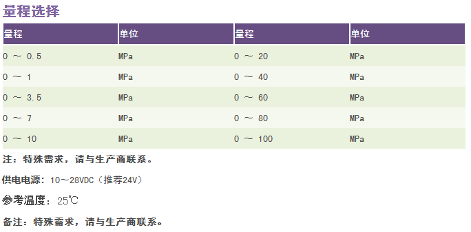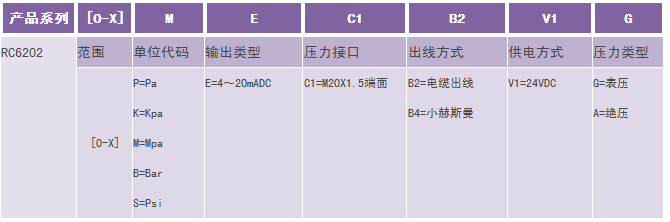 举例:RC6202-[0-1]M-E-C1-B2-V1-G (RC6202高温型压力变送器,量程0-1MPa, E=4~20mADC输出,压力接口M20*1.5端面,电缆出线,24V供电, 表压) 注:特殊需求,请与生产商联系。 1、选型时请注意被测介质要与产品与介质相接触的部分相兼容。 2、需要零位压力为负压的变送器时,请在订货时注明量程范围。 3、特殊要求,请与本公司商洽,并在订单中予以注明。