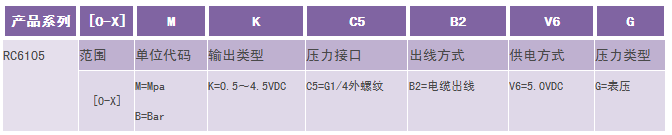 举例:RC6105-[0-1]M-K-C5-B2-V6-G (RC6105净水机专用压力变送器,量程0-1MPa, K=0.5~4.5VDC,压力接口G1/4外螺纹,电缆出线,5V供电, 表压) 注:特殊需求,请与生产商联系。 1、选型时请注意被测介质要与产品与介质相接触的部分相兼容。 2、需要零位压力为负压的变送器时,请在订货时注明量程范围。 3、特殊要求,请与本公司商洽,并在订单中予以注明。