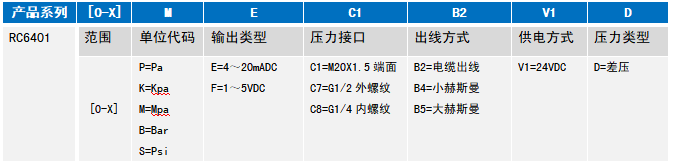 举例:RC6401-[0-1]M-E-C1-B2-V1-D (RC6401扩散硅差压变送器,量程0-1MPa,4~20mADC输出,压力接口M20*1.5端面,电缆出线,24V供电,差压) 注:1、选型时请注意被测介质,产品与介质相接触的部分相兼容。 2、特殊要求,请与本公司商洽,并在订单中予以注明。