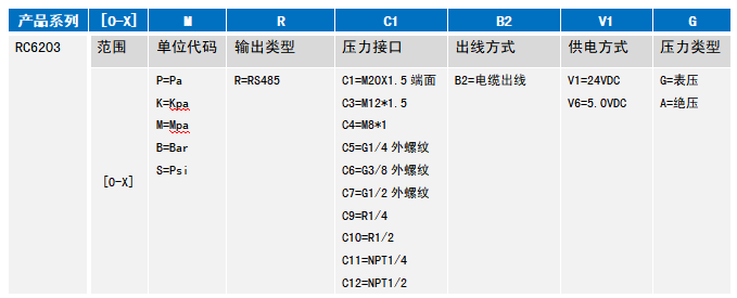 举例:RC6203-[0-1]M-R-C1-B2-V1-G (RC6203工业型压力变送器(2088壳体),量程0-1MPa,RS485输出,压力接口M20*1.5端面,电缆出线,24V供电,表压) 注:1、选型时请注意被测介质,产品与介质相接触的部分相兼容。 2、特殊要求,请与本公司商洽,并在订单中予以注明。