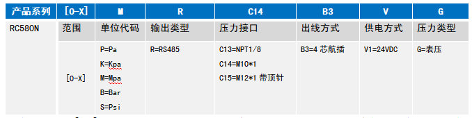 举例:RC580N-[0-1]M-R-C14-B3-V1-G(RC580N型压力变送器,量程0-1MPa, RS485输出,压力接口M10*1,出线方式为4芯航插出线,24V供电,表压) 注:1、选型时请注意被测介质,产品与介质相接触的部分相兼容。 2、特殊要求,请与本公司商洽,并在订单中予以注明。