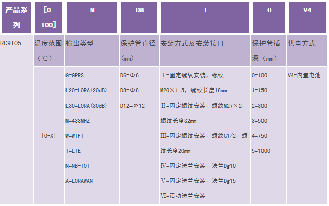 举例:RC9105-(0-100)MD8I0V4(RC9105经济型无线温度变送器,温度范围0-100度,输出433M,,护管直径Φ8,安装方式固定螺纹M20*1.5,护管插深100mm,供电方式内置电池) 注:特殊需求,请与生产商联系。 1、选型时请注意被测介质要与产品与介质相接触的部分相兼容。 2、特殊要求,请与本公司商洽,并在订单中予以注明。