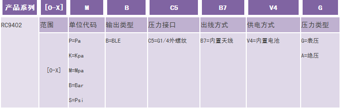 举例:RC9402-[0-1]M-B-C5-B7-V4-G(RC9402蓝牙型低压无线压力变送器,量程1Mpa;输出蓝牙;压力接口G1/4外螺纹,内置天线,内置电池;表压) 注:特殊需求,请与生产商联系。 1、选型时请注意被测介质要与产品介质相接触的部分相兼容。 2、特殊要求,请与本公司商洽,并在订单中予以注明 |