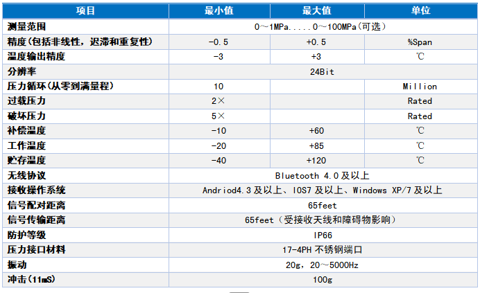 产品概述RC9406无线蓝牙型中高压压力变送器采用标准的2.4GHz无线通信协议,低功耗,电池使用寿命长。芯体采用玻璃微熔工艺,其特点是不锈钢单件一体化结构;无O型圈、无焊缝、无硅油;压力范围广;量程覆盖范围宽;过载能力强。