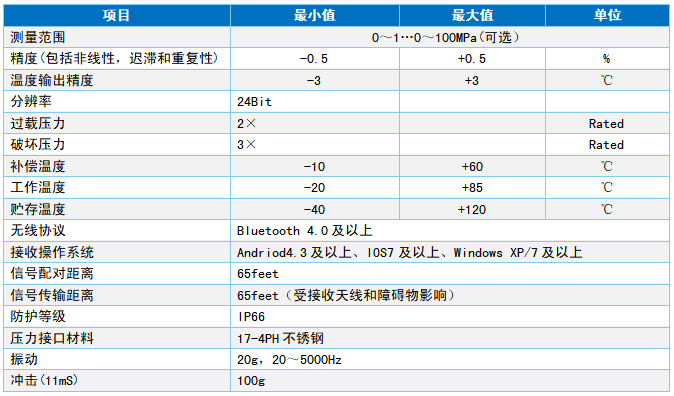 产品概述RC9401无线蓝牙型中高压压力变送器采用标准的2.4GHz无线通信协议,低功耗,电池使用寿命长。芯体采用硅微熔工艺,特点是不锈钢单件一体化结构;无O型圈、无焊缝、无硅油;压力范围广、量程覆盖范围宽;过载能力强。