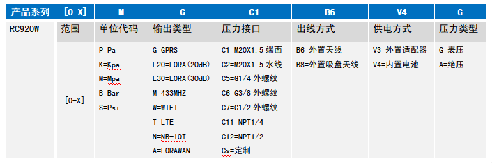 举例:RC920W-[0-1]M-G-C1-B6-V4-G (RC920W防爆型无线网关压力变送器,压力范围0-1MPa,输出GPRS,螺纹接口M20*1.5,外置天线,内置电池供电,表压) 注:1、选型时请注意被测介质,产品与介质相接触的部分相兼容。 2、特殊要求,请与本公司商洽,并在订单中予以注明。 安装指南 RC920W防爆型无线网关压力变送器可以通过压力管接头直接装在液压管路上。在关键应用场合(如剧烈震动或冲击),压力管接头可以通过微型软管进行机械解耦。若用微型软管安装,壳体必须单独接地。拆卸仪表时,不可对仪表壳体施力。不允许更换元器件或结构,以免影响防爆性能。压紧密封圈建议定期更换,以确保变送器可靠工作。